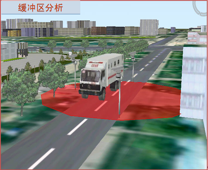 系統(tǒng)是基于三維地理信息系統(tǒng)的,所以可以提供多種高級分析工具。對于危險品運輸車輛,當(dāng)其駛?cè)氤鞘蟹秶鷥?nèi),則進入一級警備狀態(tài)。首先對車載危險源(車輛運輸?shù)奈矬w:如氣體、液體等)進行獲取,采用緩沖區(qū)分析方法,建立擴散模型;根據(jù)危險品的性質(zhì)及汽車行駛的路線,當(dāng)車輛到達事故高發(fā)區(qū)時,進行提醒;對可能的事故災(zāi)害做到提前預(yù)警。一旦出現(xiàn)事故,可以迅速安排相關(guān)人員救援、指揮現(xiàn)場群眾有序疏散等,采取有效措施,積極應(yīng)對。